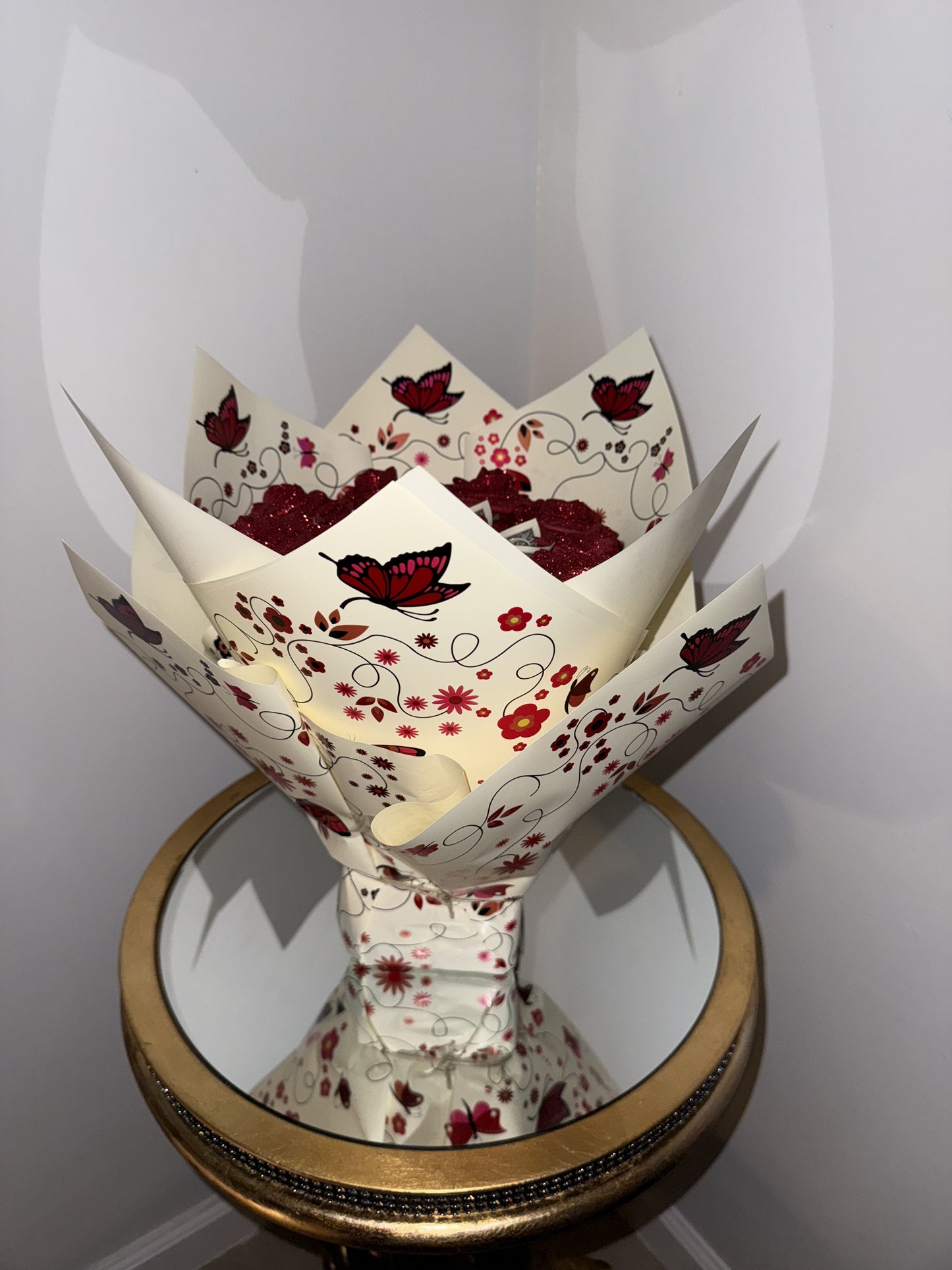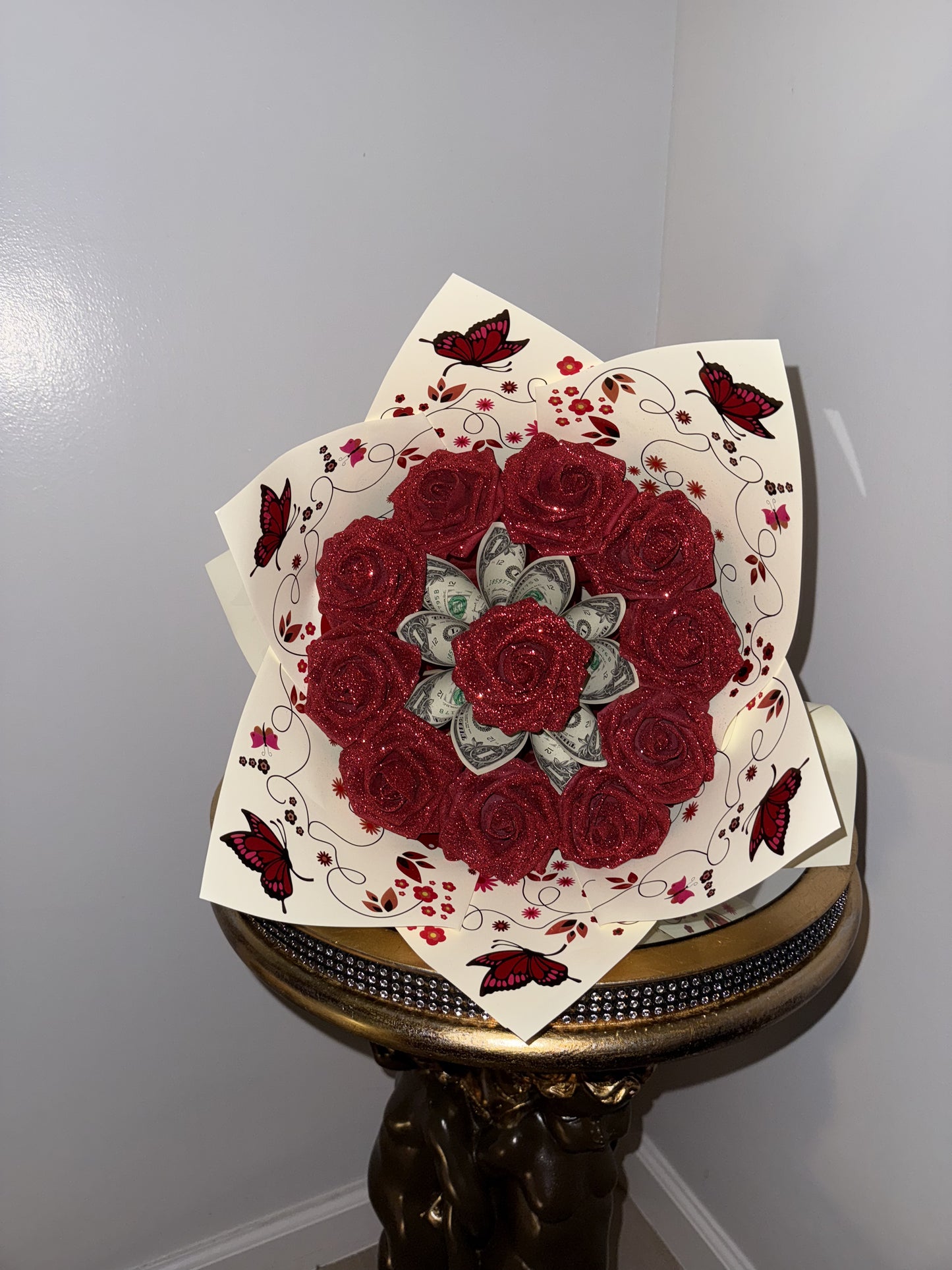 This bouquet has 6 bills of $1 bill. Very cute and small with 11 roses. Made with real money and glittered foam roses. Choose your custom rose color, wrapping paper color, and any additional add ons you would like for the bouquet.